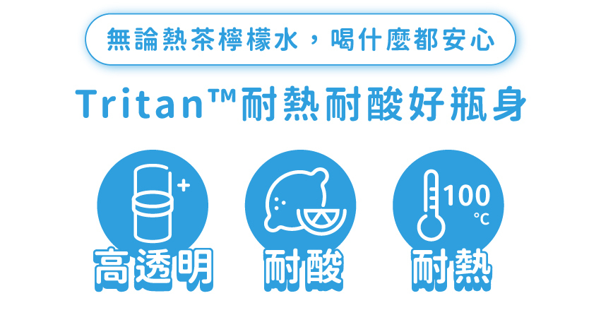 ◌ 美國 Tritan™ TX1001 材質,耐溫 0°C 到 100°C。