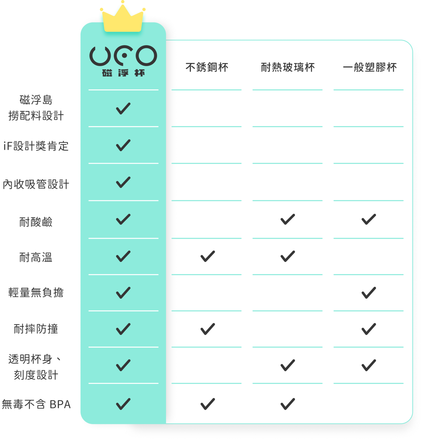 UFO 磁浮杯材質精挑細選,只要會碰到飲品的所有配件,皆為耐酸鹼、耐高溫的無毒材質。
