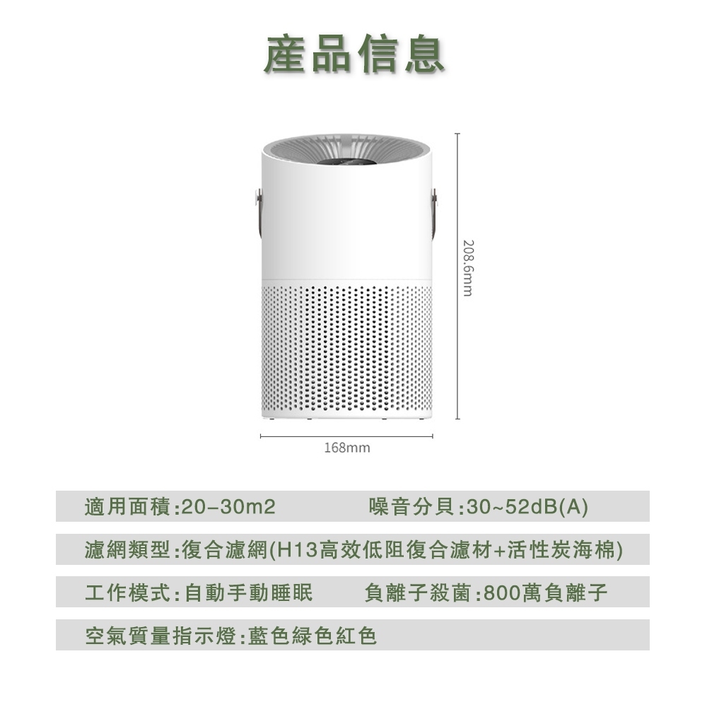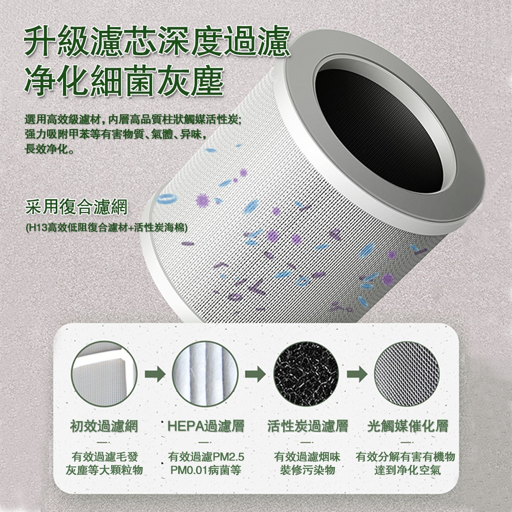 濾網類型:複合濾網(H13高效低阻複合濾材+活性碳海綿)指示燈