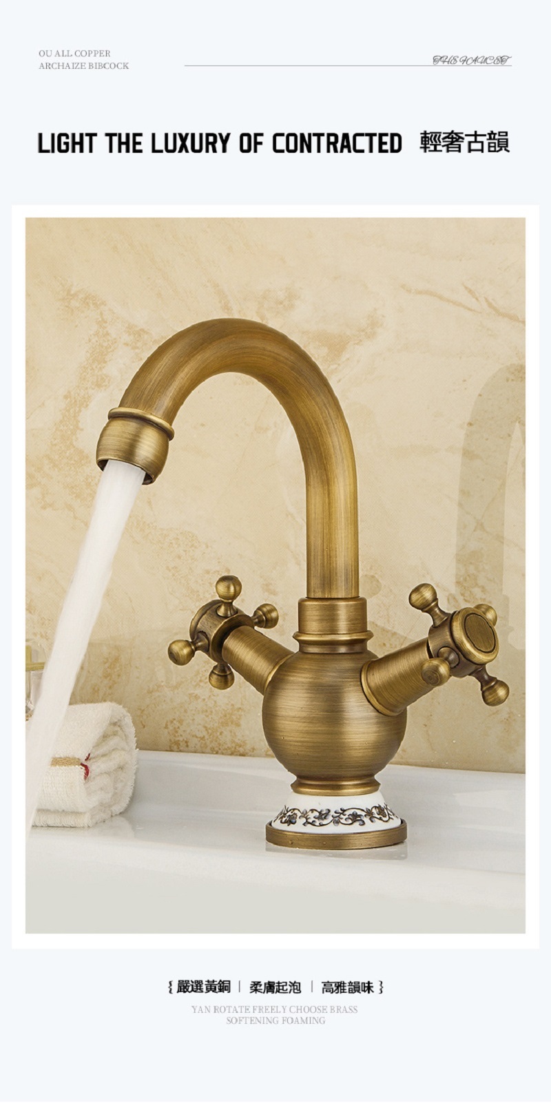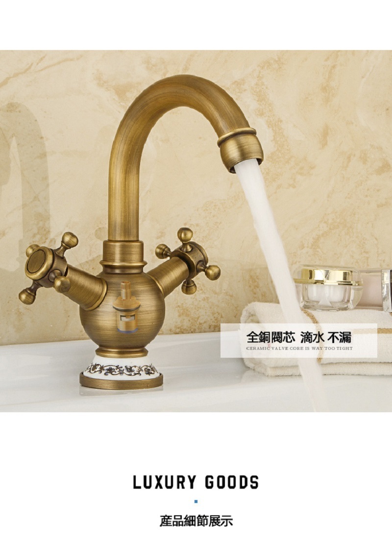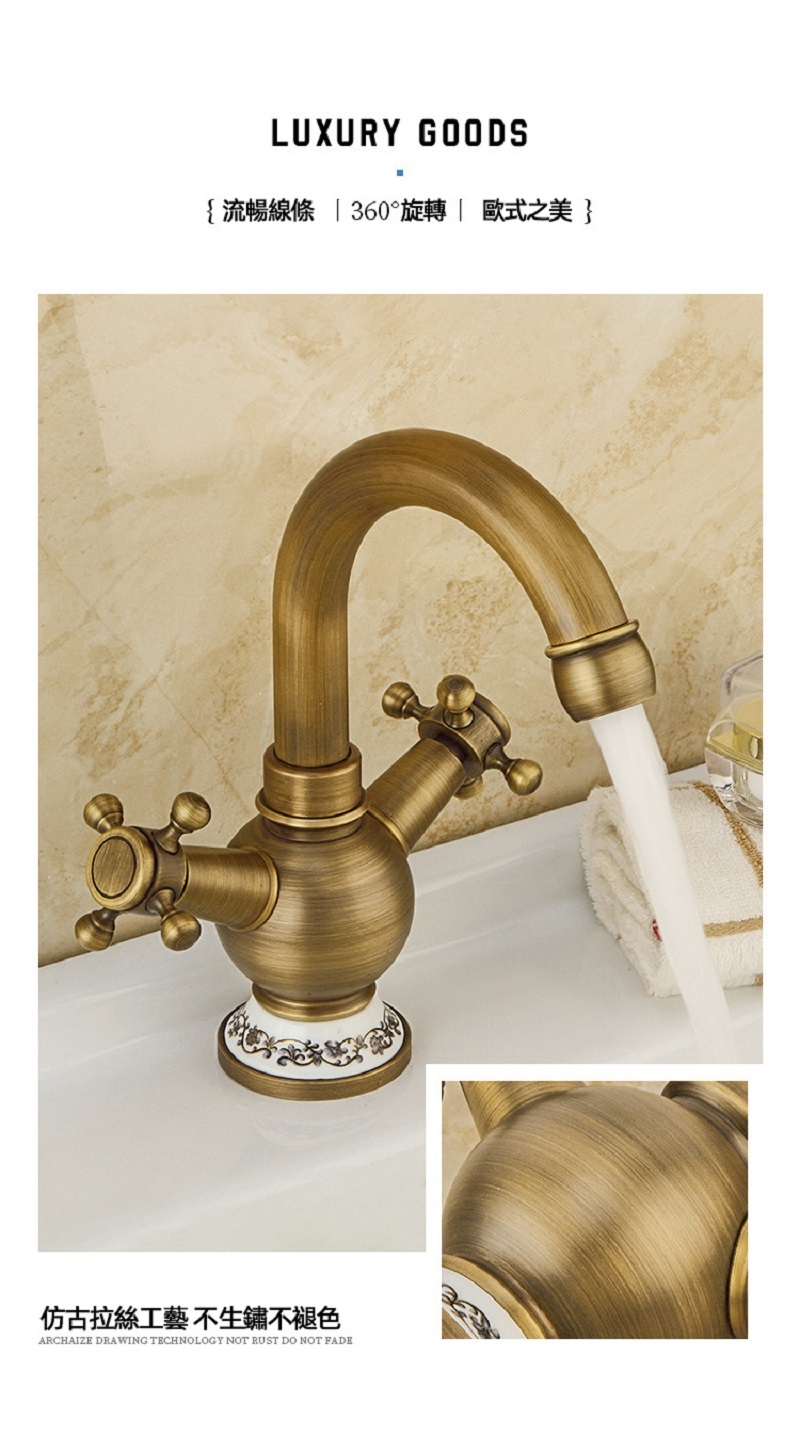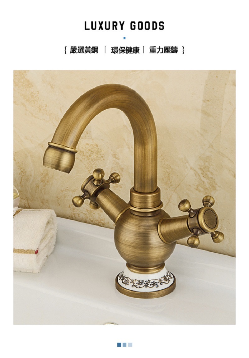 【小山THL】歐式仿古 全銅青花瓷 雙把手龍頭 複古單孔面盆 冷熱雙用 防濺水龍頭