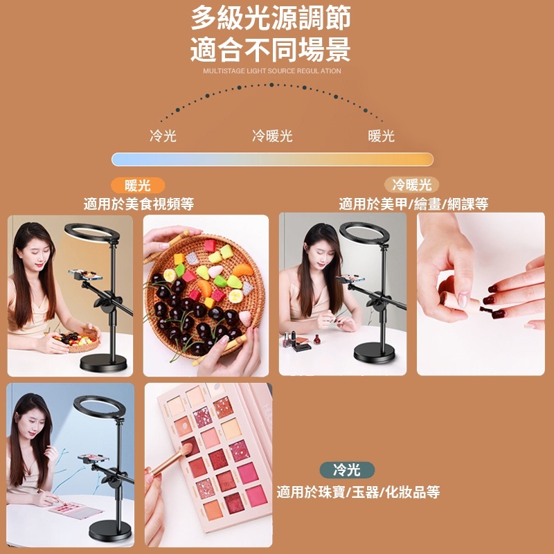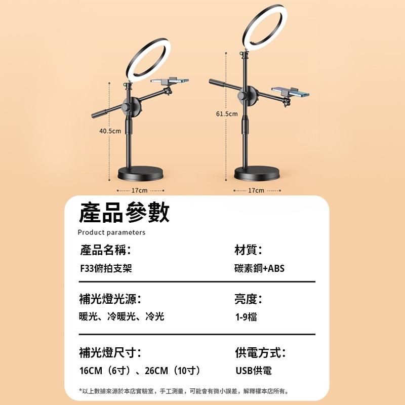 桌面型:底盤款17公分、高度41.5-61.5公分(可調節)、手機桿38公分