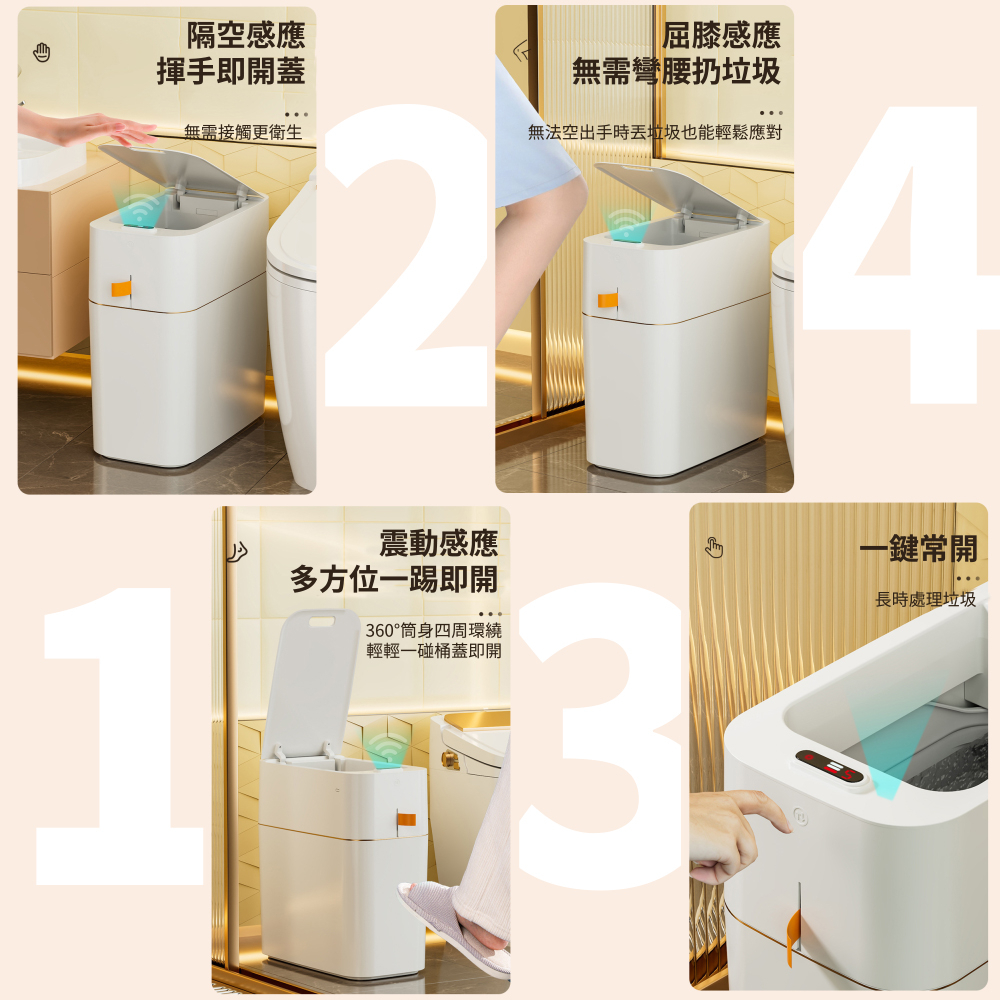 ❺震動感應:多方位一踢即開,360°桶身四周環繞,輕輕一碰桶蓋即開
