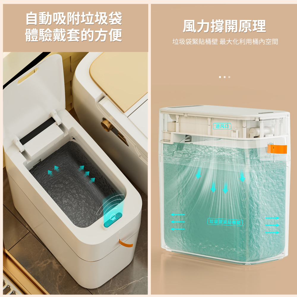 風力撐開原理,垃圾袋緊貼桶壁,最大化利用空間,拒絕用手撐開攜帶細菌