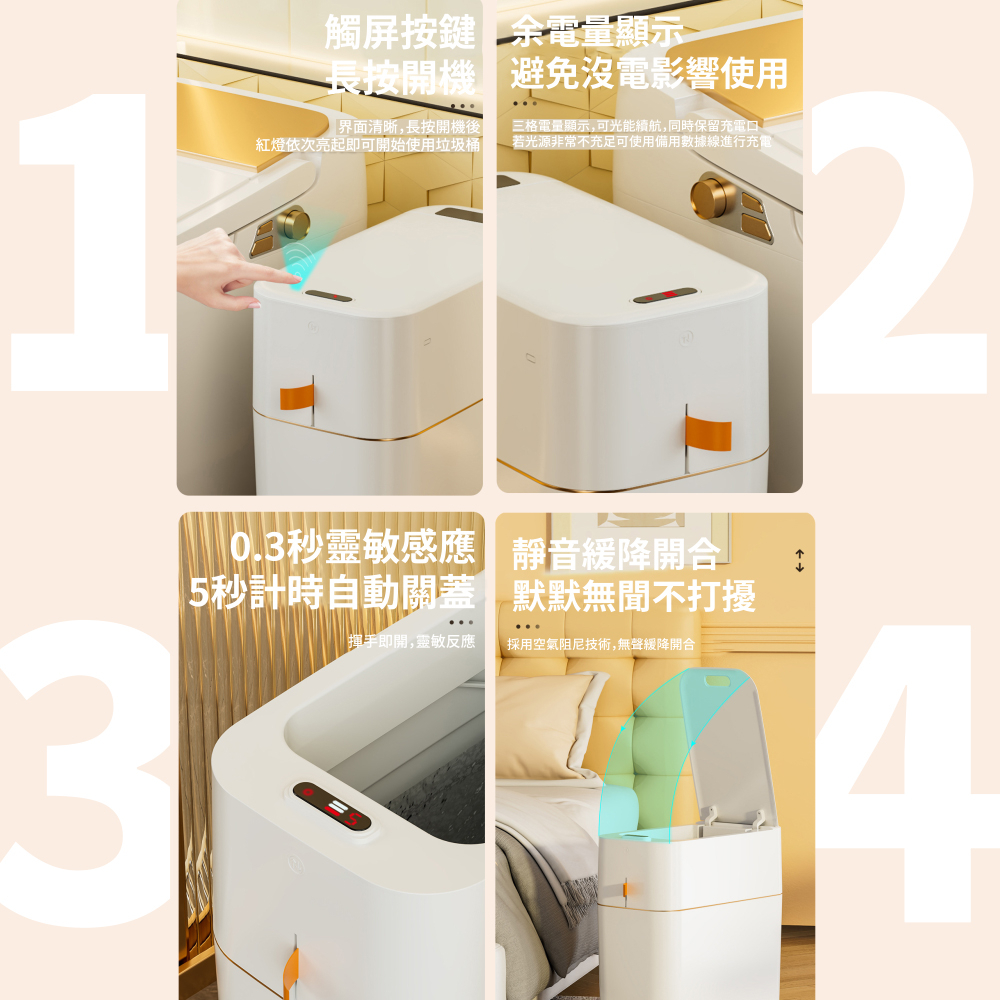 ❾觸屏按鍵:長按開機,界面清晰,長按開機後,紅燈依次亮起即可開始使用垃圾桶