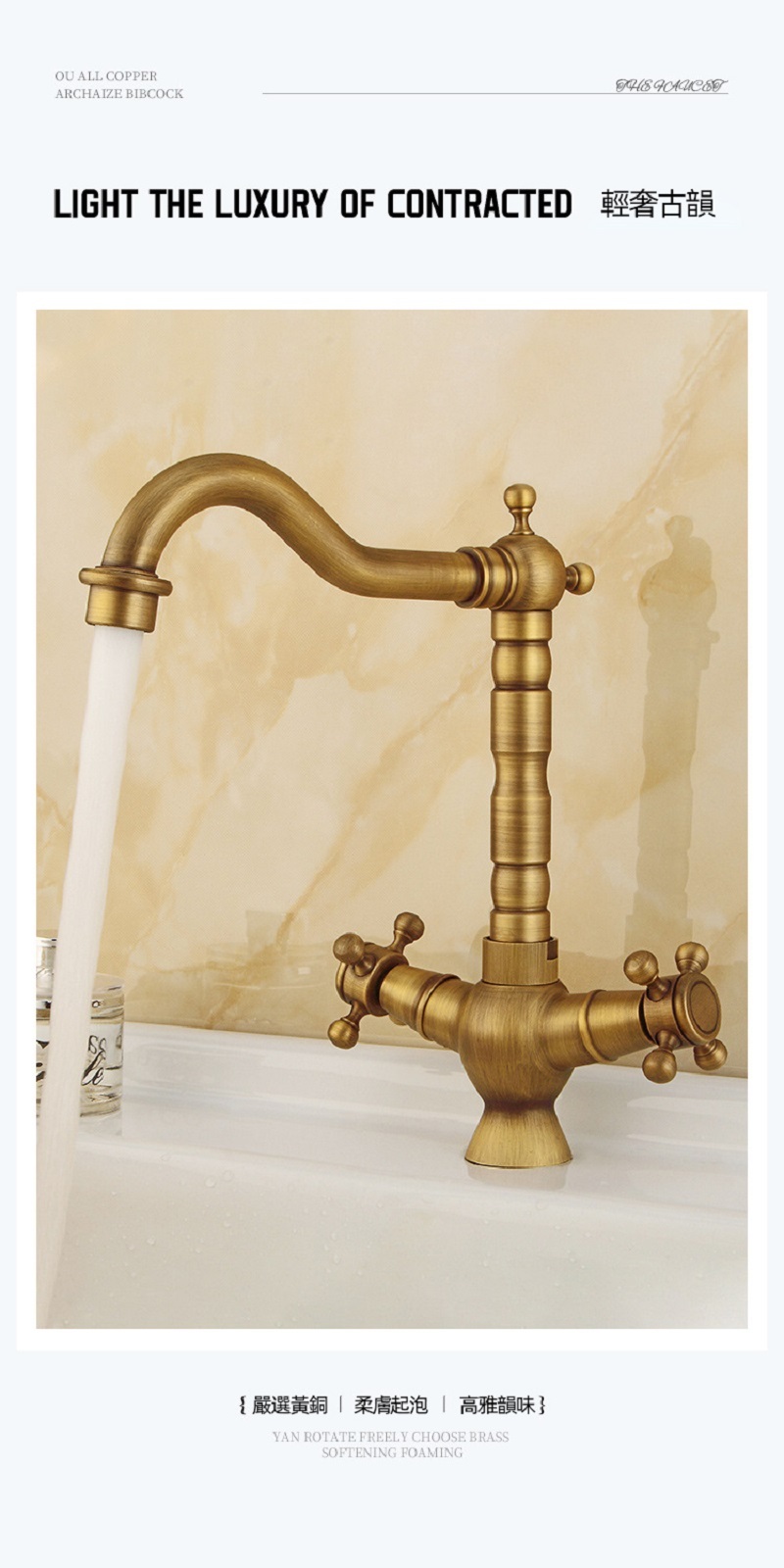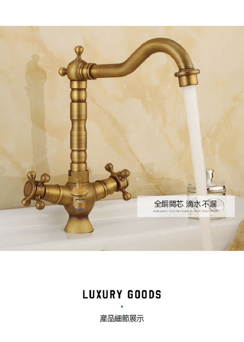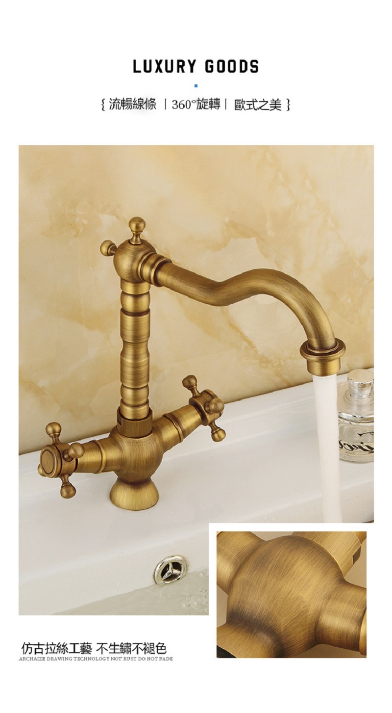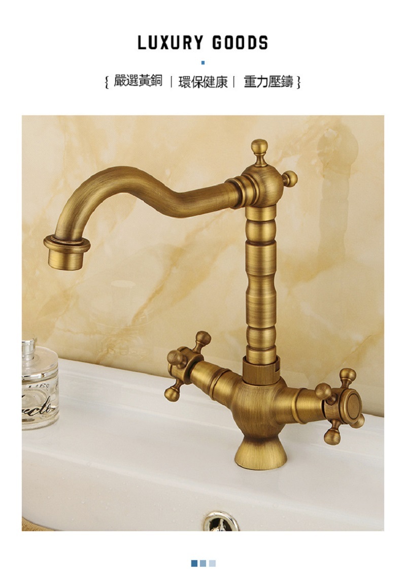 【小山THL】全銅仿古雙把手輪面盆龍頭家用廚房水槽洗菜盆冷熱水龍頭防濺